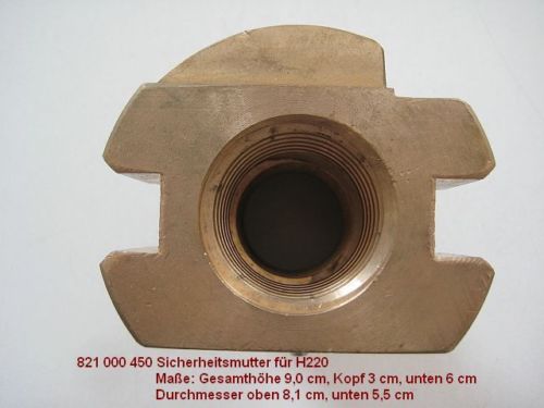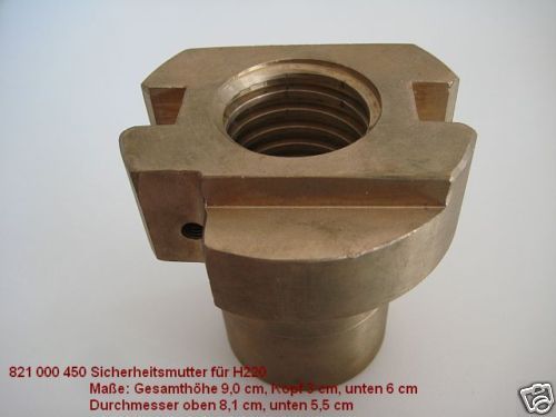 | Sie kaufen hier eine Sicherheitsmutter (safety nut) für Romaico, Zippo oder Koni 2 Säulen - Hebebühnen. Sie haben die Wahl zwischen einer oder mehreren Muttern. Die genaue Menge können Sie unter dem Angebotspreis bei der Anzahl eingeben. Die Sicherheitsmutter auch passend in anderen Modellen. Maße: Gesamthöhe 9 cm, Kopf 3 cm, unten 6 cm, Durchmesser oben 8,1 cm, unten 5,5 cm. Andere Ersatzteile finden Sie in unserem Shop, indem Sie auf die entsprechende Kategorie klicken. Nachdem Sie den Artikel in den Warenkorb gelegt haben, können Sie weitere Artikel in unserem Onlineshop kaufen. Fragen beantworten wir auch gerne per Email oder unter +49(0)176/21193525 und +49(0)38295/774067. |