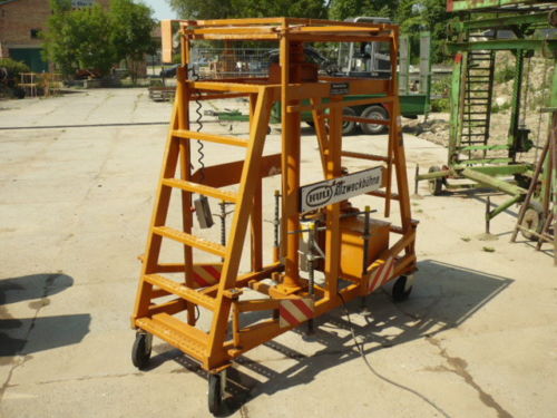 (Das Gerät hat eine Nutzlast von 300 kg = 2 Personen + 140 kg Zuladung. Die maximale zulässige Seitenkraft beträgt 30 daN. Die Hubarbeitsbühne besteht aus einem fahrbaren Unterbau mit Hartplastikrädern (kann auf Fahrgestell montiert werden), einem Arbeitskorb und einer hydraulischen Steuereinheit.