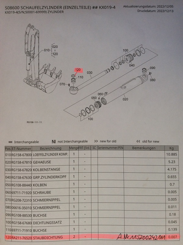 Staubdichtung 120 70 Part No. RA111-6733-0 Kubota KX41-3V Minibagger