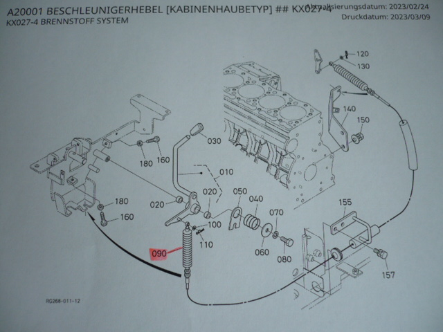 1x Gaszug / Handgaskabel für Beschleunigerhebel Kubota Minibagger Typ KX27-4 (Länge = 2370mm) vierte Generation KUB. Nr. RG268-35152.