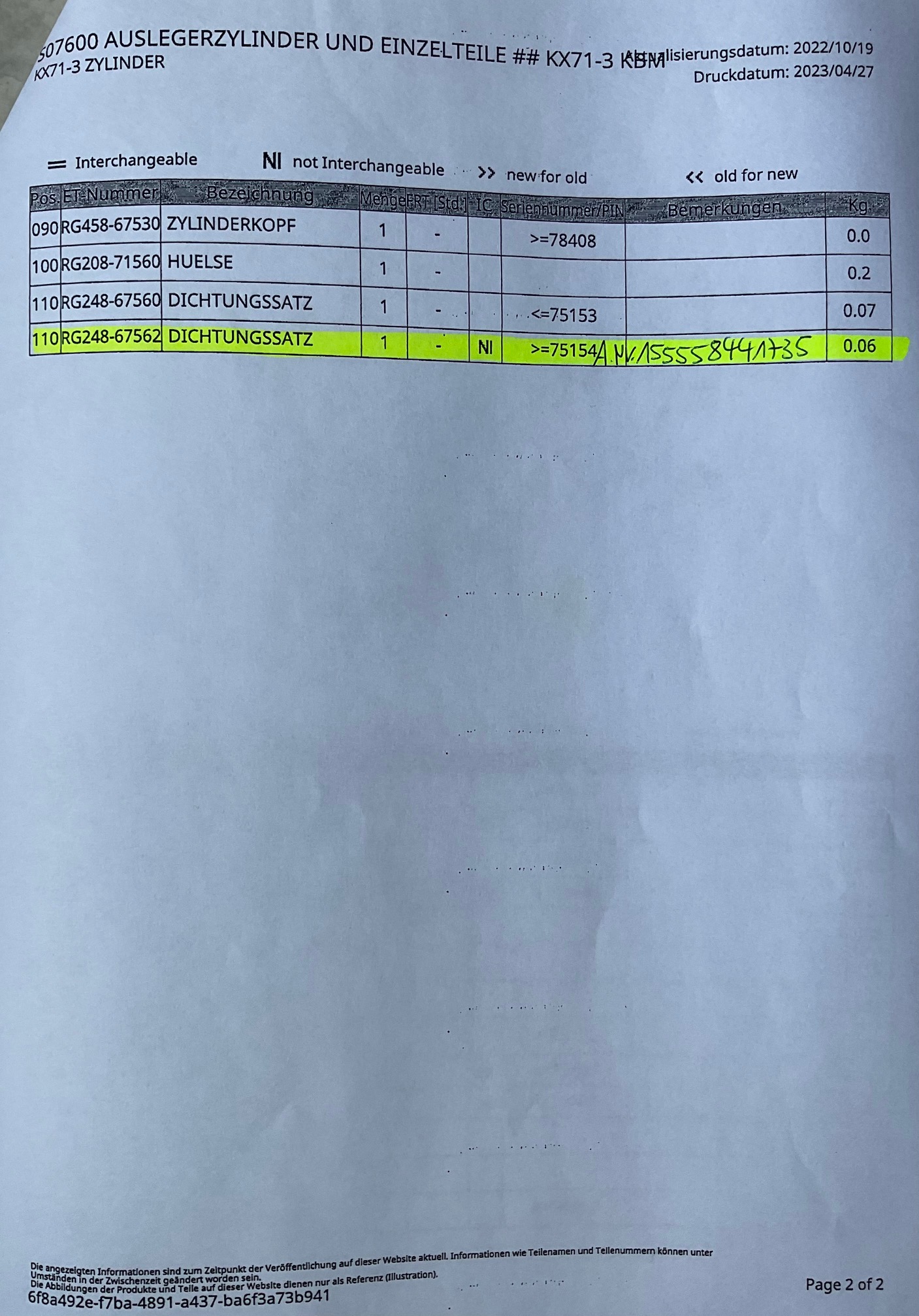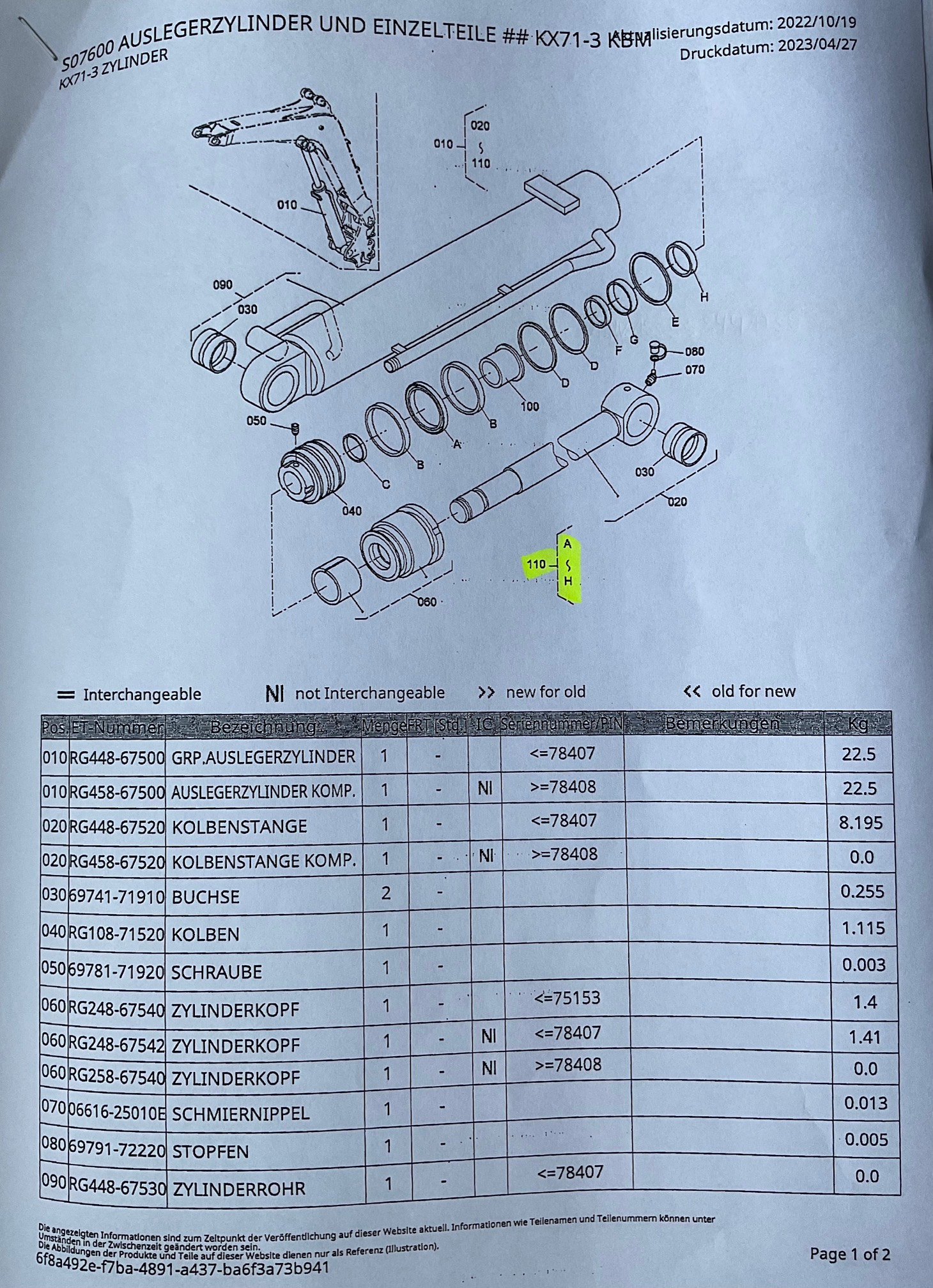 1x Dichtungen für Rohrzylinder Armzylinder/Arbeitszylinder/Auslegerzylinder 60mm, Arm heben Kubota Minibagger ab Seriennummer >=75154 Typ KX61-3, KX71-3 dritte Generation KUB. Nr.RG248-67562.