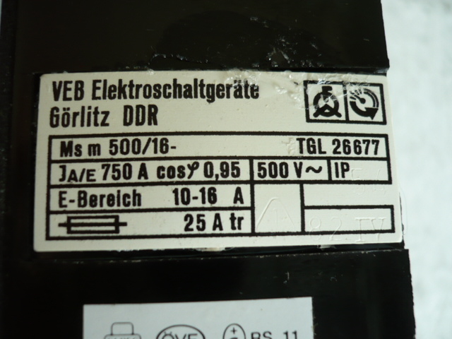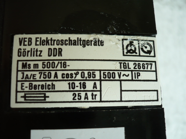 | Sie kaufen hier einen Schalter für diverse DDR Geräte und Anlagen. Sie haben die Wahl zwischem einer oder mehreren Starkstromschaltern. Motorschalter-Daten: Ms 500/16 TGL 26677 500V le 16A/35 A tr E-Bereich 10-16A Material Bakelit IP54. Maße Isolierstoffgehäuse: 85mm Breite x 145mm Länge x 80mm Tiefe. Andere Ersatzteile finden Sie in unserem Shop, indem Sie auf die entsprechende Kategorie klicken. Nachdem Sie den Artikel in den Warenkorb gelegt haben, können Sie weitere Artikel in unserem Onlineshop kaufen. Fragen beantworten wir auch gerne per Email oder unter +49(0)176/21193525 und +49(0)38295/774067. |