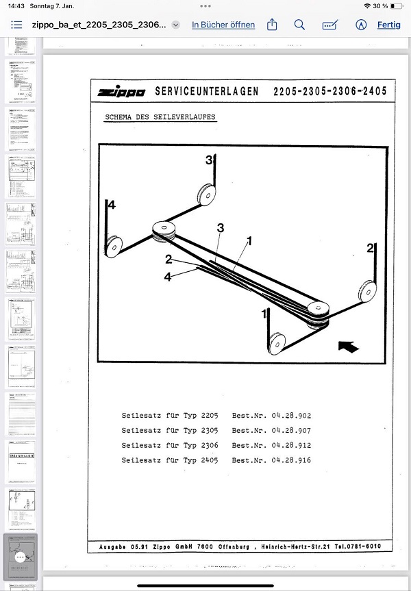 Sie kaufen hier ein Set Steuerseile (safety cable) für Zippo Typ 2305 2205 2306 / 4 Säulen - Bühnen. |