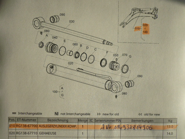 1x original working cylinder / pipe cylinder mounting cylinder, lifting mounting arm Kubota mini excavator type KX36-3 / KX41-3 (SC) third generation KUB. No.RG138-67700, RG 138-6770-0.