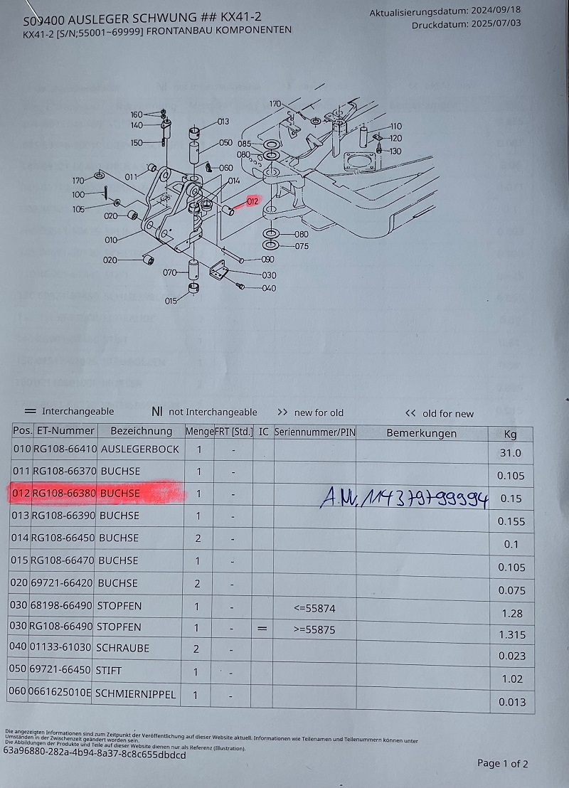 1x Sleeve for Kubota mini excavators type KX41-2S (V) second generation KUB...