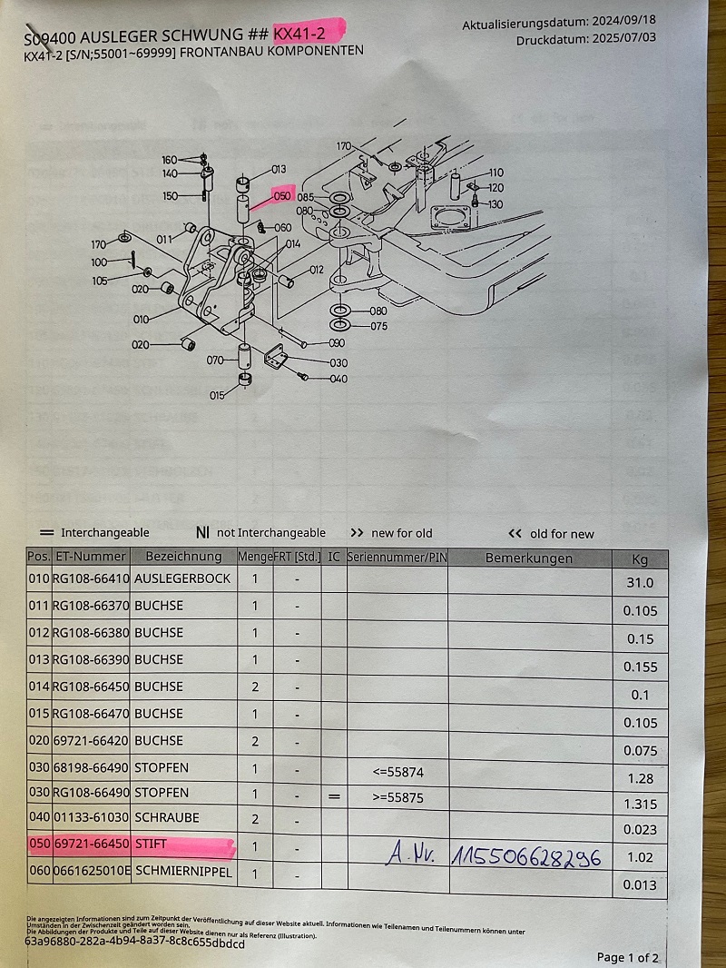 1x bolt (pin) for swing bracket (from serial number >55404) Kubota mini...