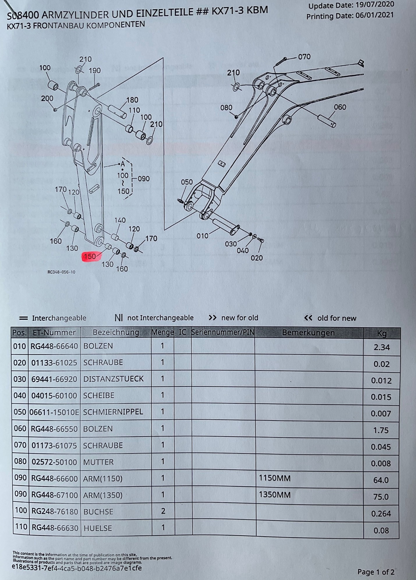 1x steel bushing for stretching dipper arm Kubota KX71-3 series (item 150 on exploded drawing) for Kubota mini excavator type KX71-3 third generation KUB No. RG448-66650 or RG 448-6665-0.