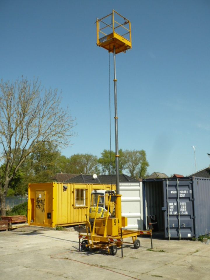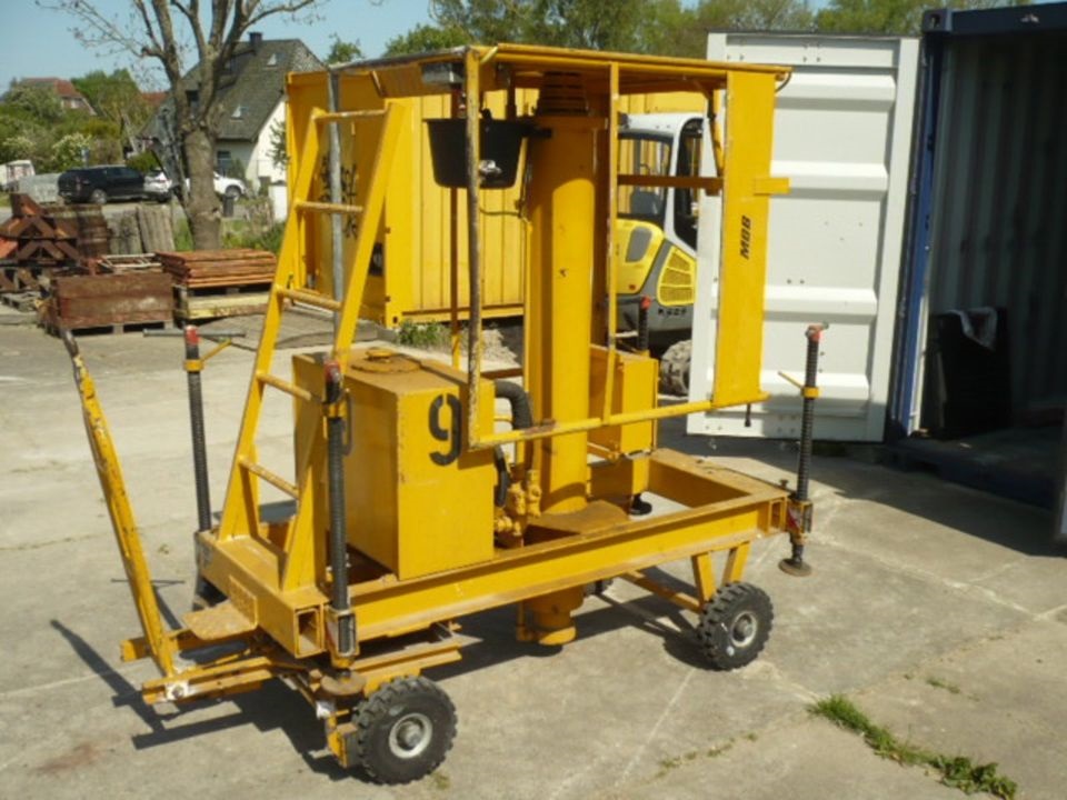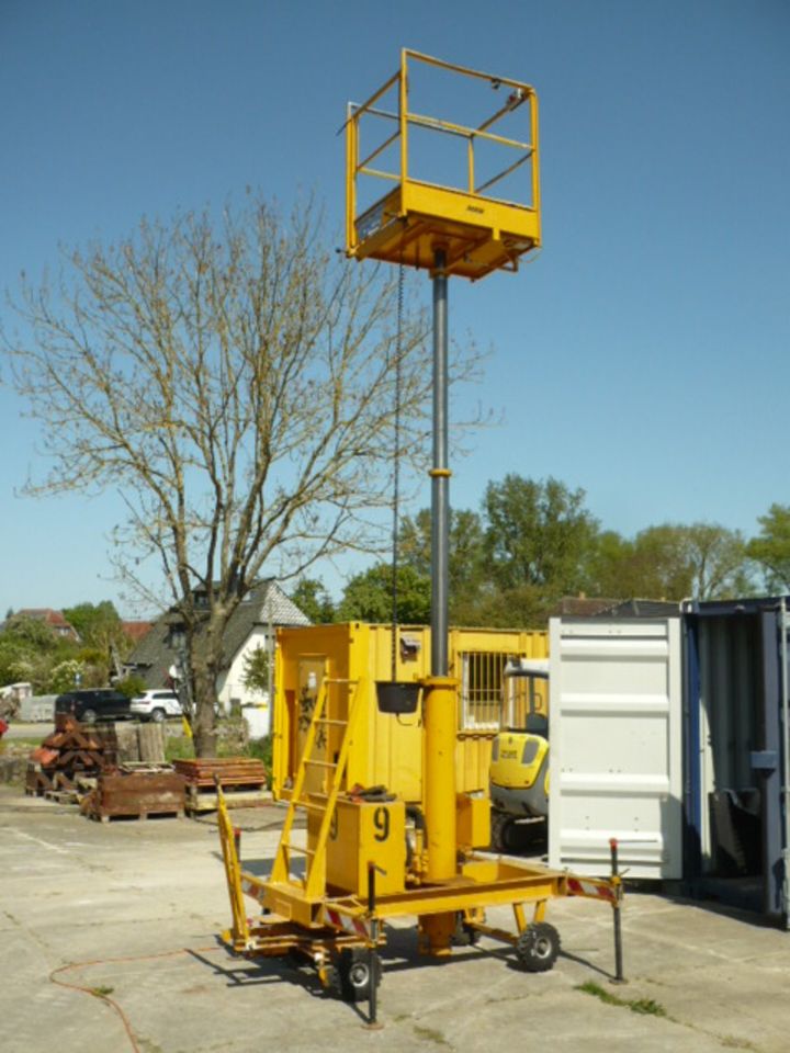 (The device was built to lift two people + 80 kg payload or a gross vehicle weight of 300 kg to heights that cannot normally be reached with ladders. The aerial work platform consists of a mobile substructure, two movable wheels, two fixed wheels on solid rubber tires, a work basket and a hydraulic control unit.)