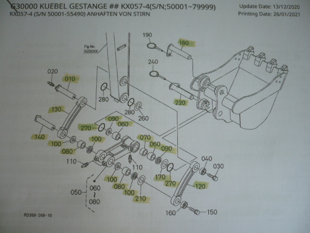 1x bolt set kit & bushing set bucket KX series (all positions underlined on exploded view) for Kubota mini excavator type KX 057-4 (serial number >51270) & U55-4 fourth generation KUB No. NZB 171060.